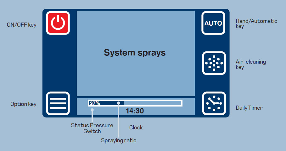 The AUTO key is used to switch between manual and automatic mode(green= auto mode). In manual mode, the system runs continuously in the set interval, in automatic mode it runs parameter-controlled, either via the connected sensors or via the external climate computer. The system will not operate without a signal from the climate computer and so the sensors must be uncapped, operational and the climate computer set to AUTO and ON.