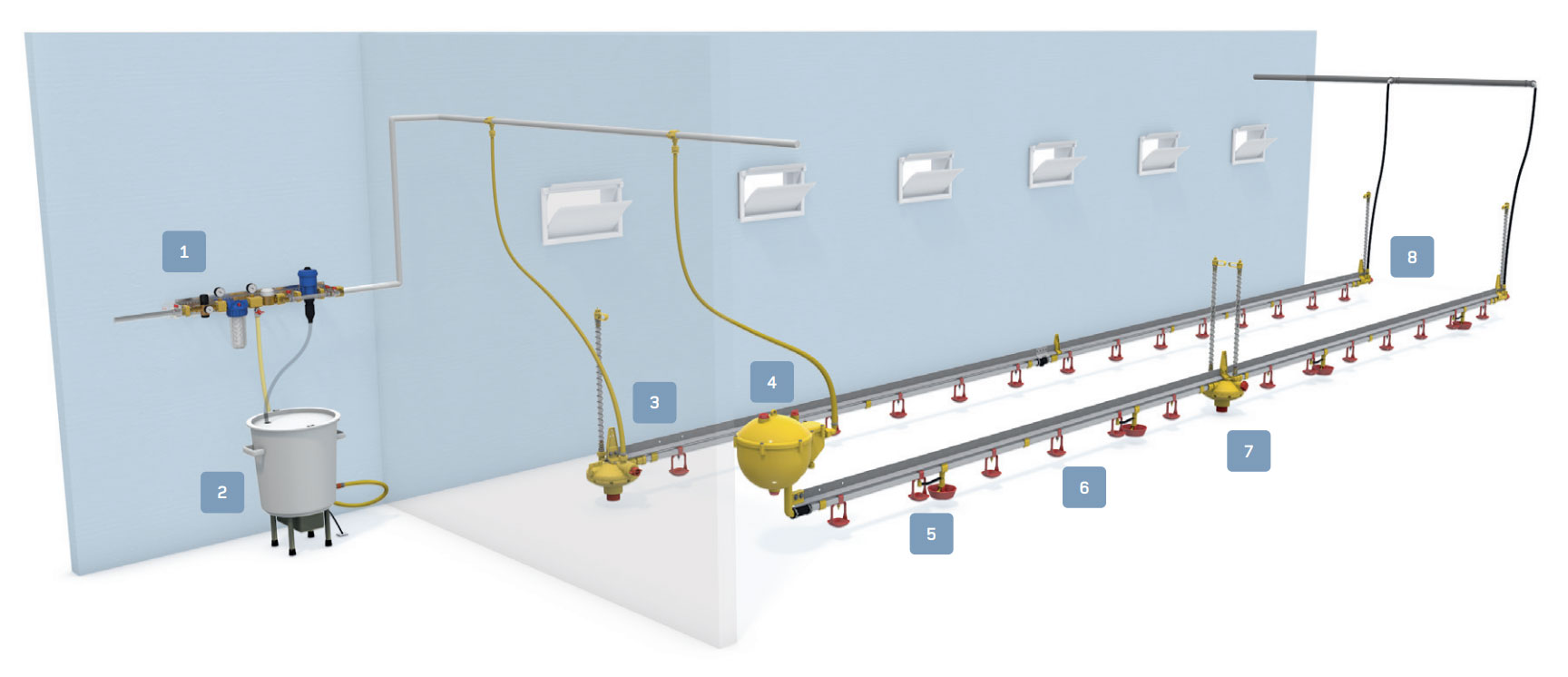 The LUBING Floor-watering system for broilers consists of the following elements: Water supply, Drinking elements, Breather unit, Suspension.