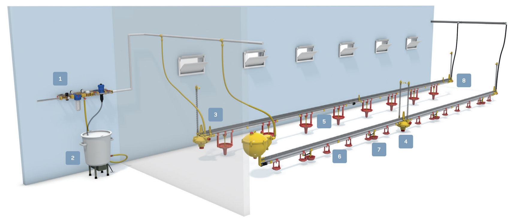 The main water supply secures an optimum water quality for a long service life of the nipple drinkers. The water should have the quality of drinking water. In any case, the water must be filtered. The water runs from the main water supply through the pressure regulator or the ball tank with an integrated flush system into the drinking lines. Both versions are available for front or middle installations.