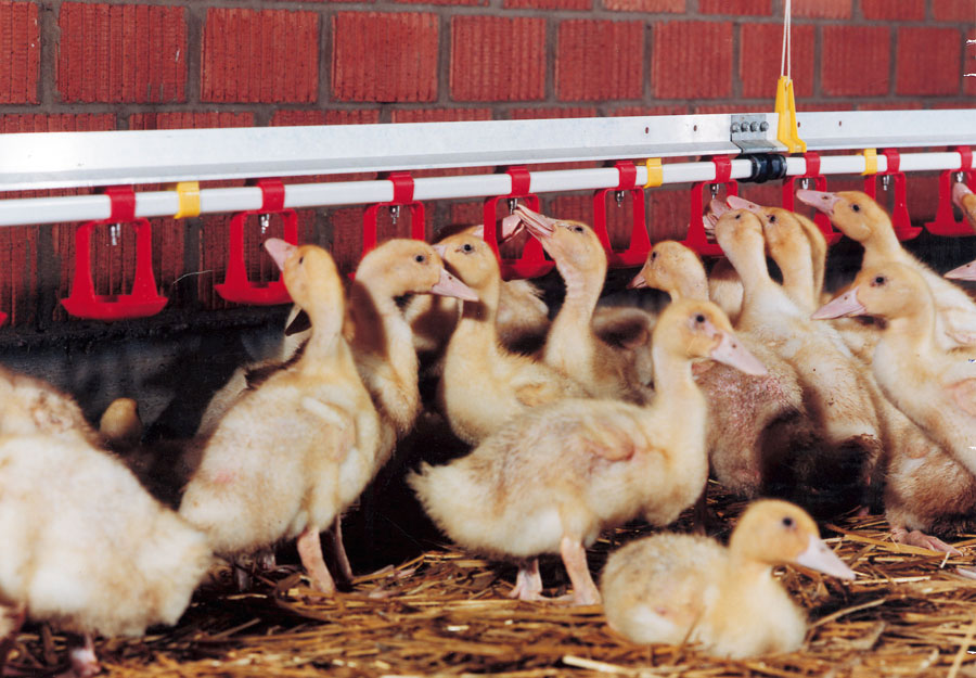 The animals can dip their head entirely into the tray with the additional cup drinker. The shape of the tray minimises water losses. This water supply, adapted to the animal’s biological requirements, fully complies with the Council of Europe’s recommendation on Peking ducks. In addition to water absorption, it cleans the beak and plumage. Animal welfare and animal health are thus strengthened for optimum performance.